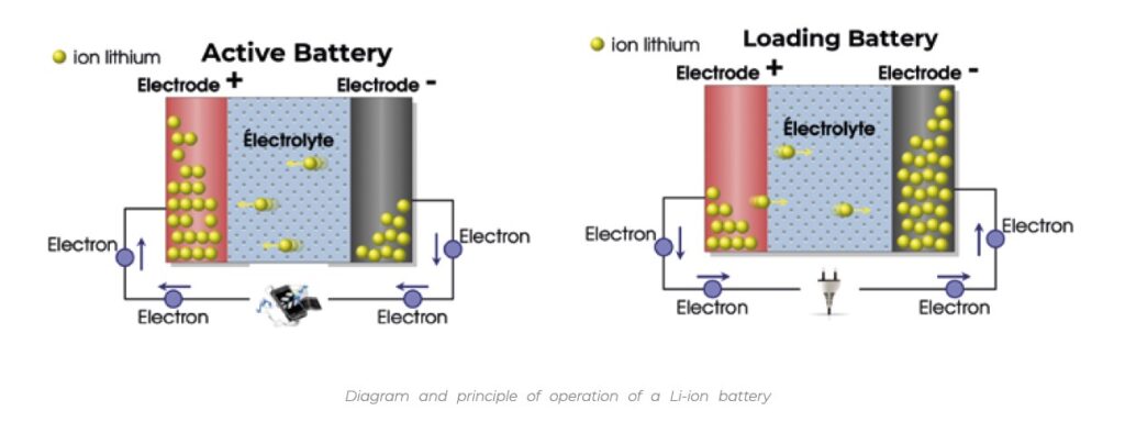 Li-ion batteries are made up of a multitude of cells, each one being able of generating a few volts. Every cell is formed of two electrodes that will exchange ions, lithium in Li-ion batteries. These ions come mainly from the electrolyte salts present in the cell. The Li+ ions migrate from the anode to the cathode during the discharge according to a reversible phenomenon that allows the battery to be recharged as shown in the diagrams below.